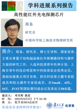2023.06.05:邓勇辉教授邀请中国科学院上海技术物理研究所的周易研究员作了题为“高性能红外光电探测芯片”的学术报告,化学系师生20余人参加了此次报告,并与周易研究员进行了激烈的讨论,现场学术氛围浓郁。