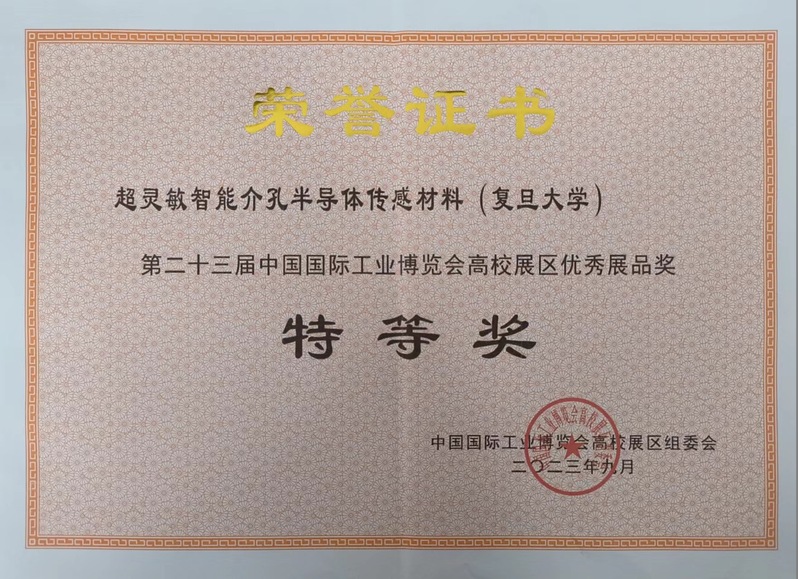 2023.09:热烈祝贺课题组“超灵敏智能介孔半导体传感材料”荣获“第二十三届中国国际工业博览会感谢展区优秀展品奖”的特等奖