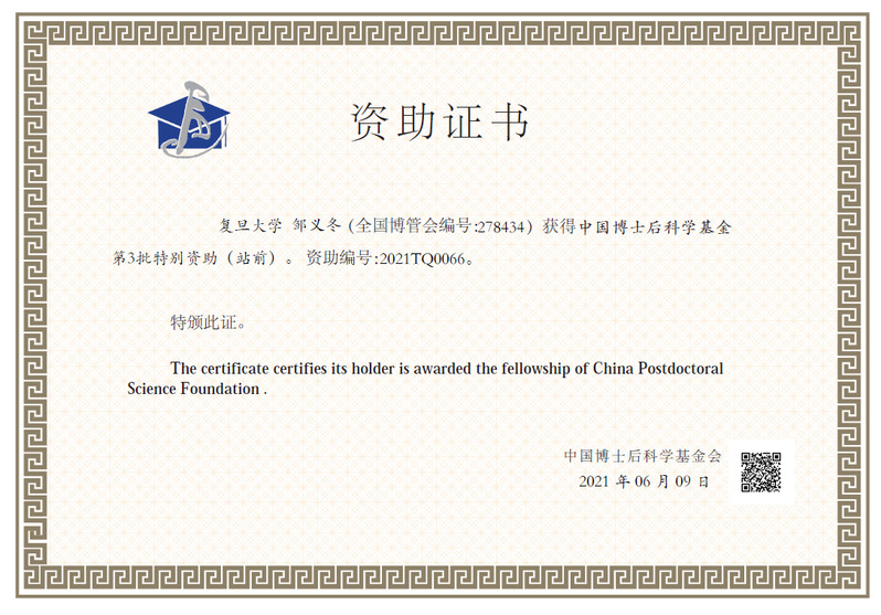 2021.06.09:热烈祝贺邹义冬博士获得中国博士后科学基金第3批特别资助(站前)!