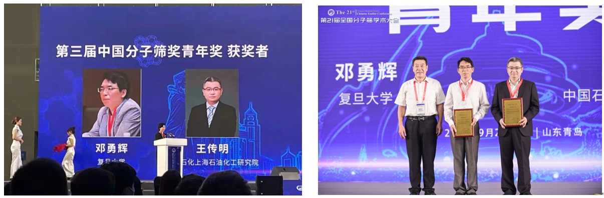 2021.09.28:热烈祝贺课题组邓勇辉教授获得第三届中国分子筛青年奖(共两人)。 中国化学会分子筛专业委员会于2017年首次设立“中国分子筛奖”,每两年评选一次(与全国分子筛学术大会召开年同步),分别评选出“中国分子筛成就奖”、“中国分子筛青年奖”(获奖当年不超过45周岁)和“中国分子筛新秀奖”(获奖当年不超过35周岁),并在全国分子筛学术大会上颁奖。