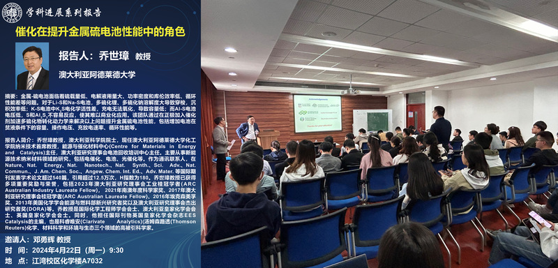 2024.04.22:邓勇辉教授邀请澳大利亚科学院院士、澳大利亚阿德菜德大学化工学院纳米技术首席乔世璋教授作了题为“催化在提升金属硫电池性能中的角色”的学术报告,介绍了通过在正极加入催化剂加速多硫化物转化动力学来提升金属硫电池性能的新技术,带来了一场精彩的学术盛宴。与会师生与乔世璋教授进行了激烈的交流,现场学术氛围浓厚。