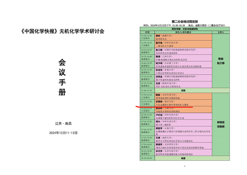 2024.12.12:邓勇辉教授应邀参加“《中国化学快报》无机化学学术研讨会”,作为大会副主席和分会的主持人,并作了题为“介孔金属氧化物半导体材料与器件”的主旨报告。
