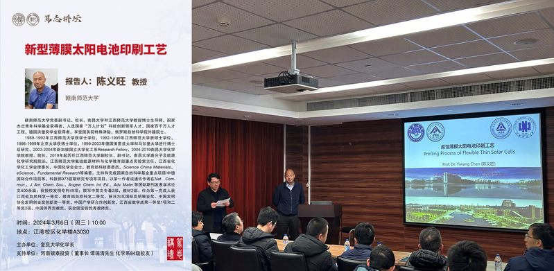 2024.03.06:邓勇辉教授邀请赣南师范大学党委副书记、校长,南昌大学和江西师范大学教授博士生导师,国家杰出青年科学基金获得者陈义旺教授作了题为“新型薄膜大阳电池印刷工艺”的学术报告,化学系师生60余人参加了报告会,并与陈义旺教授进行了热烈的讨论,现场学术氛围浓郁。