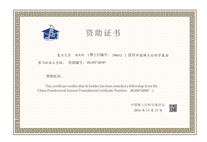 2024.11.25:热烈祝贺课题组谢文鹤博士获得“中国博士后科学基金第76批面上资助”