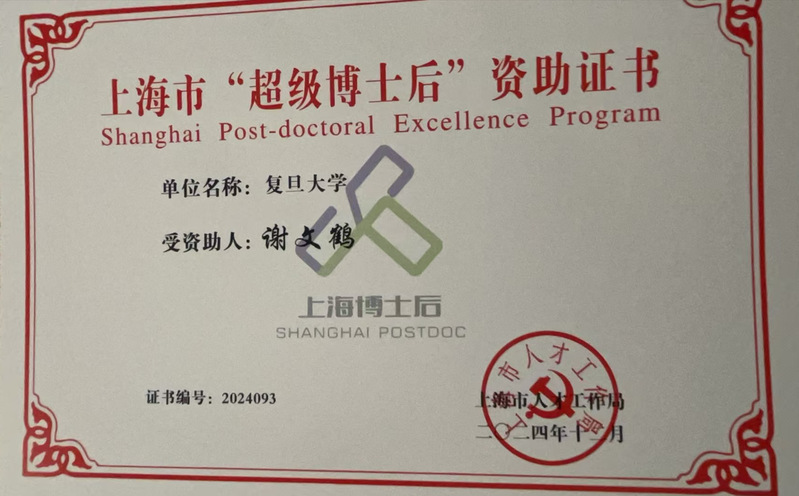 2024.12:热烈祝贺课题组谢文鹤博士获得上海市“超级博士后”资助