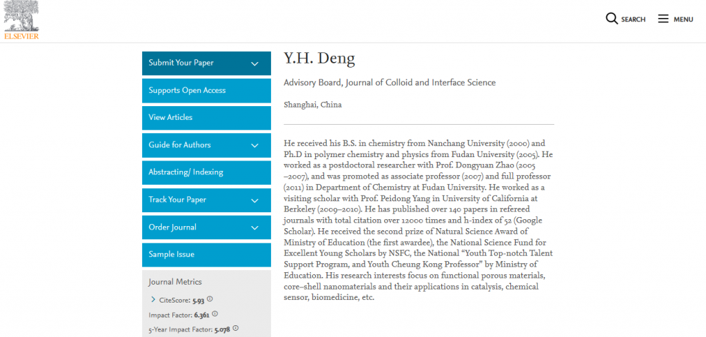 2019. 07. 25: 热烈祝贺邓勇辉教授被遴选成为 Journal of Colloid and Interface Science 期刊的编委!链接