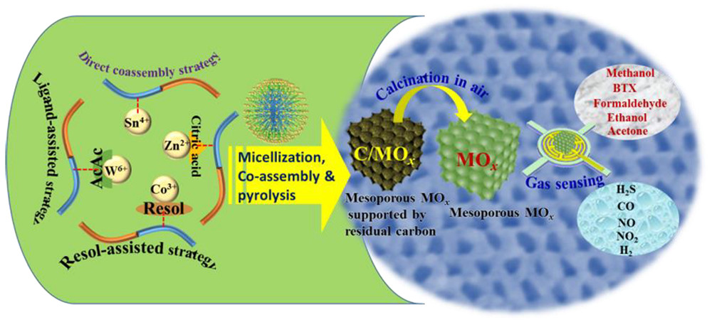 2019.03.04: 本课题组授受美国化学会权威综述性学术期刊《化学研究述评》(Accounts of Chemical Research)杂志主编Cynthia J. Burrows教授邀请撰写综述文章《富含sp2杂化碳的嵌段共聚物导向合成具有优异气敏特性的介孔金属氧化物》(“sp2-Hybridized Carbon-Containing Block Copolymer Templated Synthesis of Mesoporous Semiconducting Metal Oxides with Excellent Gas Sensing Property”),总结介绍课题组在气敏介孔金属氧化物半导体研究领域取得的相关研究成果,已在线发表(全文链接)。