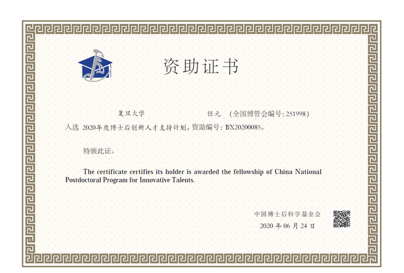 2020.06.10: 热烈祝贺任元博士获得2020年度博士后创新人才支持计划(博新计划)资助!