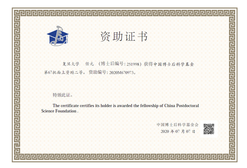 2020.07.07: 热烈祝贺课题组任元博士获得中国博士后科学基金第67批面上咨询二等!